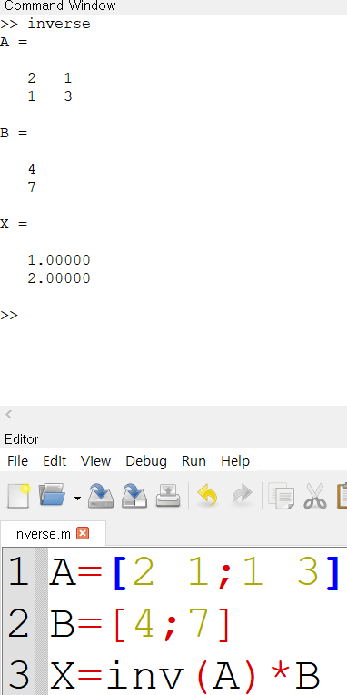 inverse라는 이름의 m파일로 저장한 뒤 실행시킨 모습입니다.