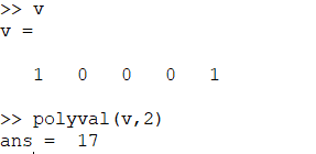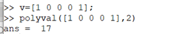한 번에 polyval([1 0 0 0 1],2)를 입력하면 아래와 같은 오류가 납니다. 반드시 행렬의 형태로 방정식을 먼저 표현 해준 뒤 함수에 집어넣어야 합니다.