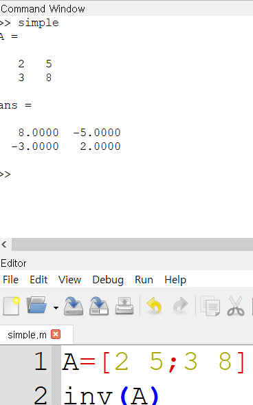 simple이라는 이름의 m파일에 저장한 뒤 실행한 모습입니다.