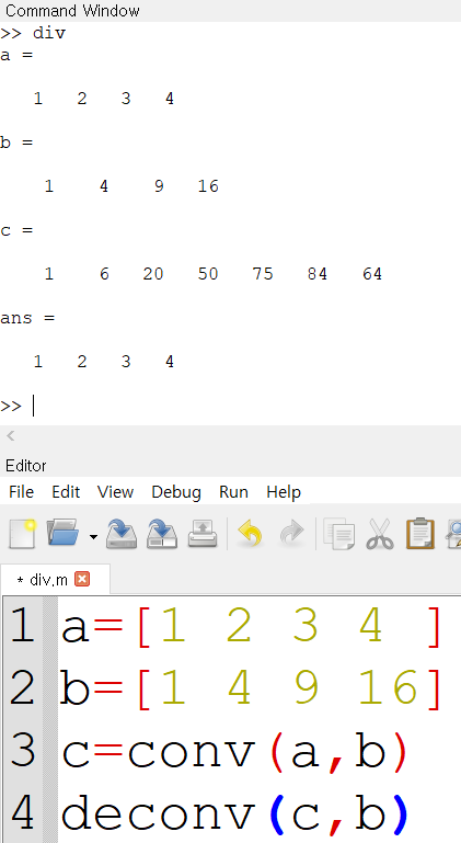 주의할 것은 deconv(c, a)에서 c가 나누어지는 식 a가 나누는 식입니다.