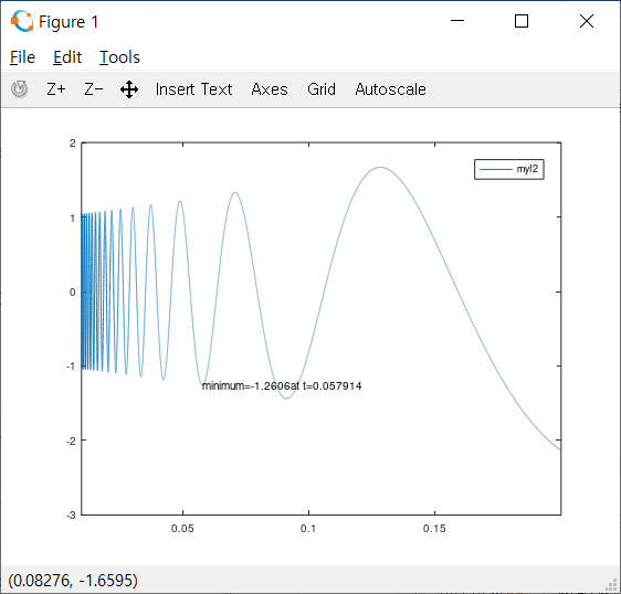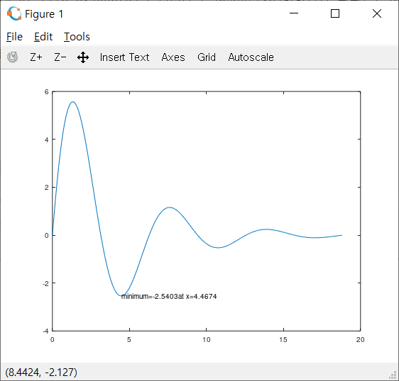 text(xval,fval,['minimum=' num2str(fval) 'at t=' num2str(xval)]);