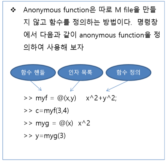 m파일에 따로 사용자 함수를 저장하지 않고 함수를 만드는 방법 이라고 생각하면 될 것 같습니다. (??)