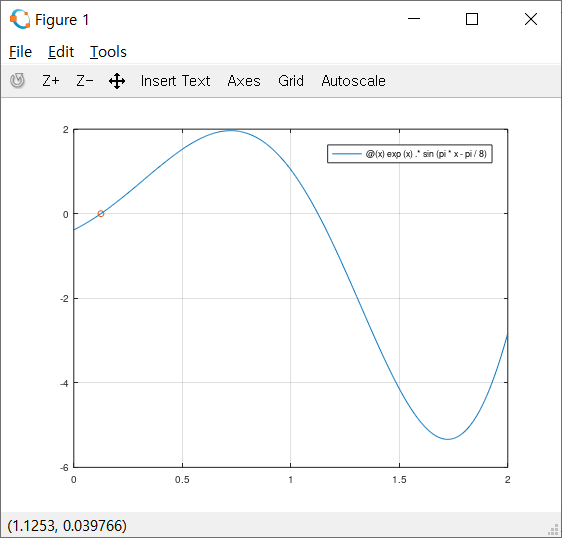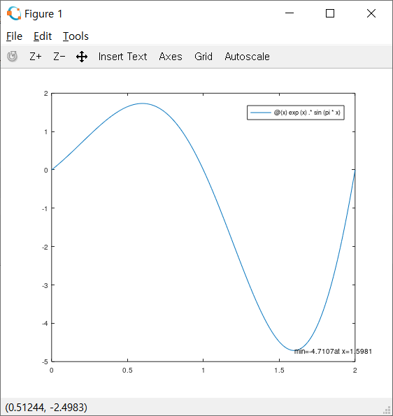 [xval1,fmin]=fminbnd(f2, 0,2) %최솟값 찾기 (함수의 핸들을 전달, x의범위)