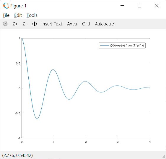 f1=@(x) exp(-x).*cos(2*pi*x);