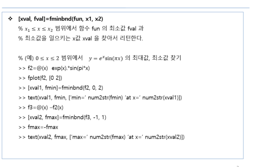 [xval2,fmax]=fminbnd(f3,0,2) %최솟값인데 변수명을 fmax로 사용했습니다.