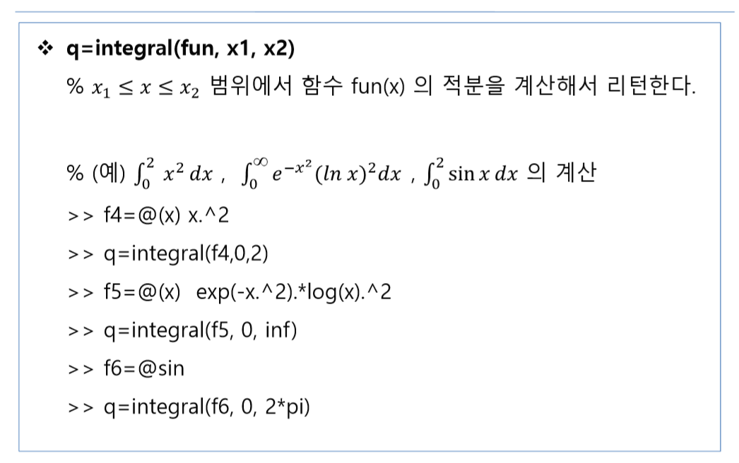 매트랩 내장함수에서 함수를 인자로 전달받는 함수에는 fplot fminbnd fzero integral