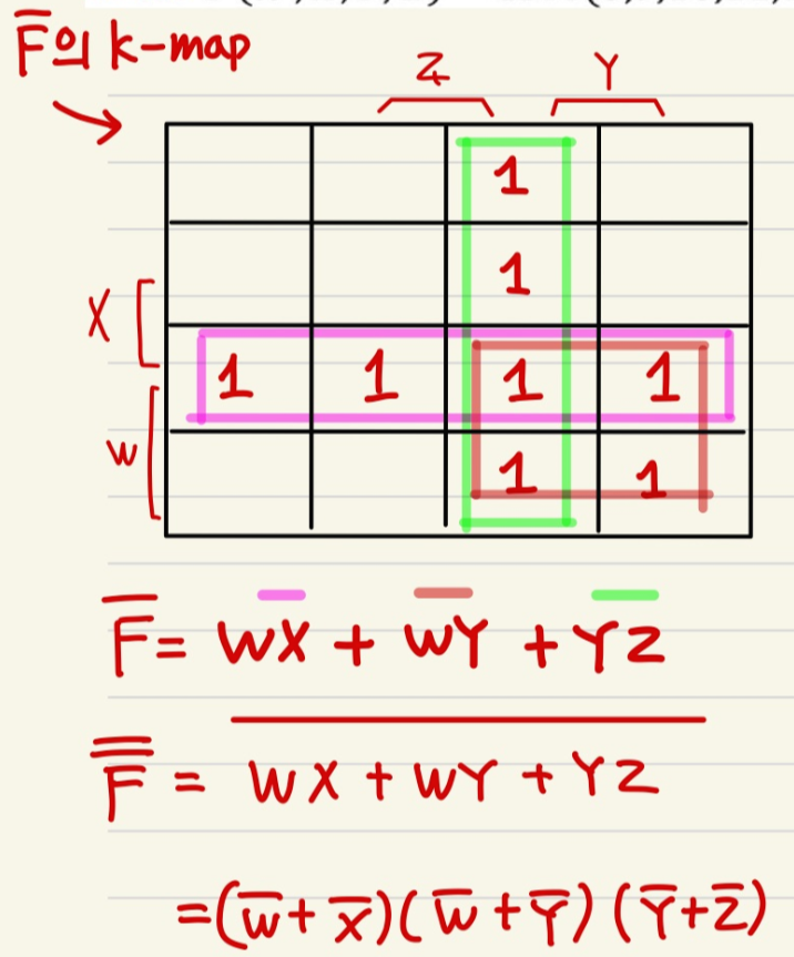 1. /F의K-MAP을 작성하고 SOP로 최적화한 뒤 보수를 취해 POS형태를 구하는 방법