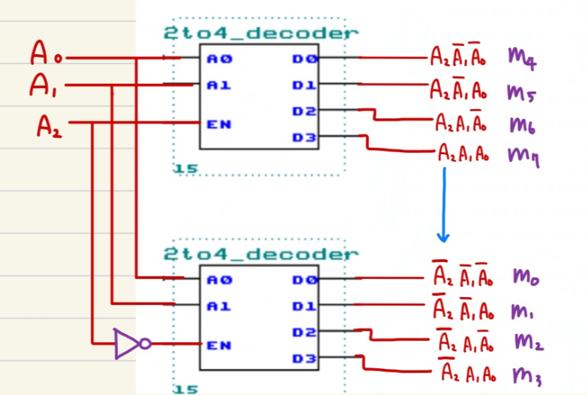 EN이 있는 2-to-4 LD 2개와 NOT게이트 하나를 사용해서 3-to-8 LD를만들라는 문제입니다.