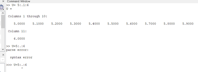 Q: 시작 값이 5이고 마지막 값이 6이며 증가 값이 0.1인 행렬 U를 만들어라.