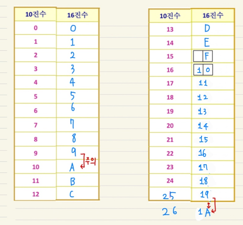 - 10이라고 나타내면 1과 0인지 10인지 헷갈리기 쉽기 때문에 10이라는 숫자 대신 A를 사용한다.