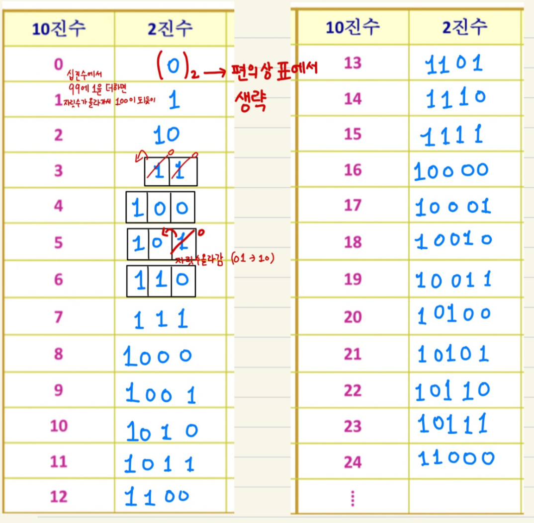 위와 같이 십진법에서는 아직 자릿수가 하나인데 이진법에서는 자릿수가 3개이다. >>0과 1밖에 없으므로 자릿수가 빨리 올라간다.