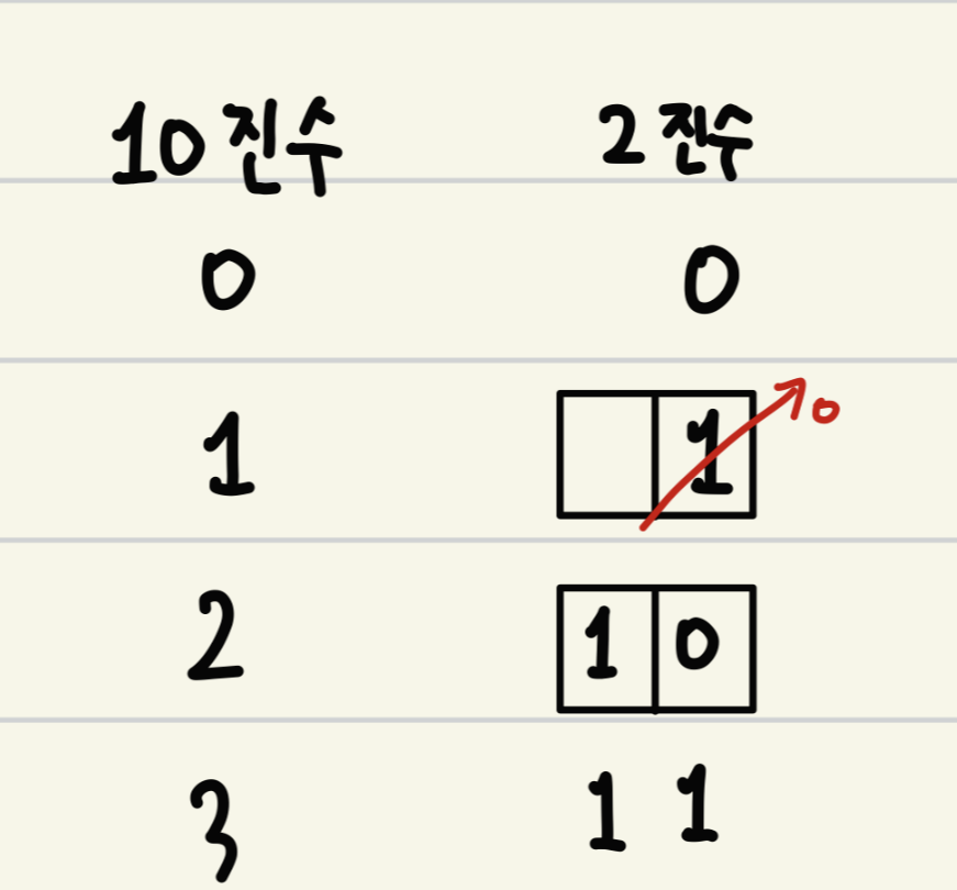 규칙은 저번 포스팅에서 이야기하였듯이 2진수는 2의 승수에서 자릿수가 바뀐다는 것입니다.