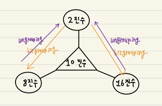 8진수에서는 숫자 하나를 3개의 bit로 나타내는 Ungrouping을 했다면