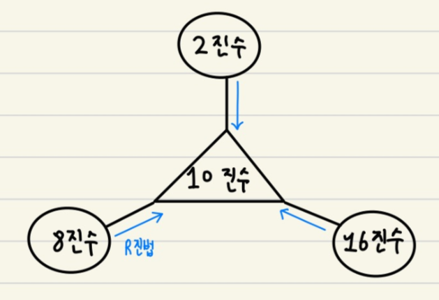 파란색 화살표가 저번 포스팅에서 한 것입니다. 어떤 진수든 10진수로 바꾸려면 R진법 공식을 사용하면 됩니다.