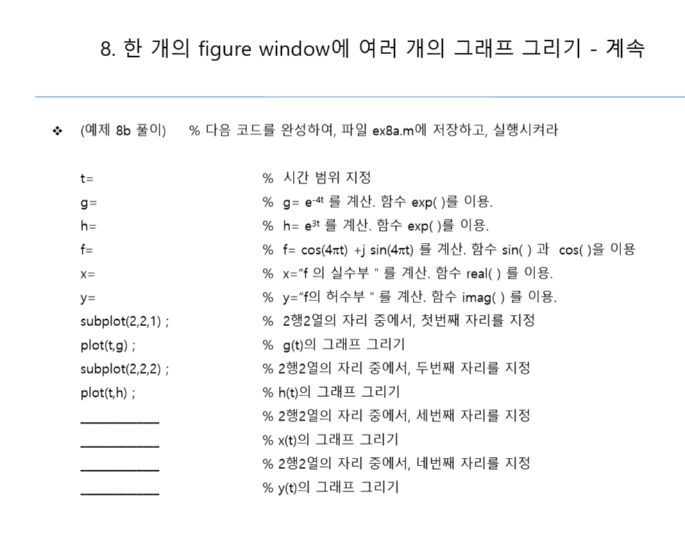 저번 시간에 공부한 내장 함수 real()과 img()가 나왔네요. subplot () 사용법을 위에서 잘 익혔다면 해결할 수 있는 문제라고 생각합니다.