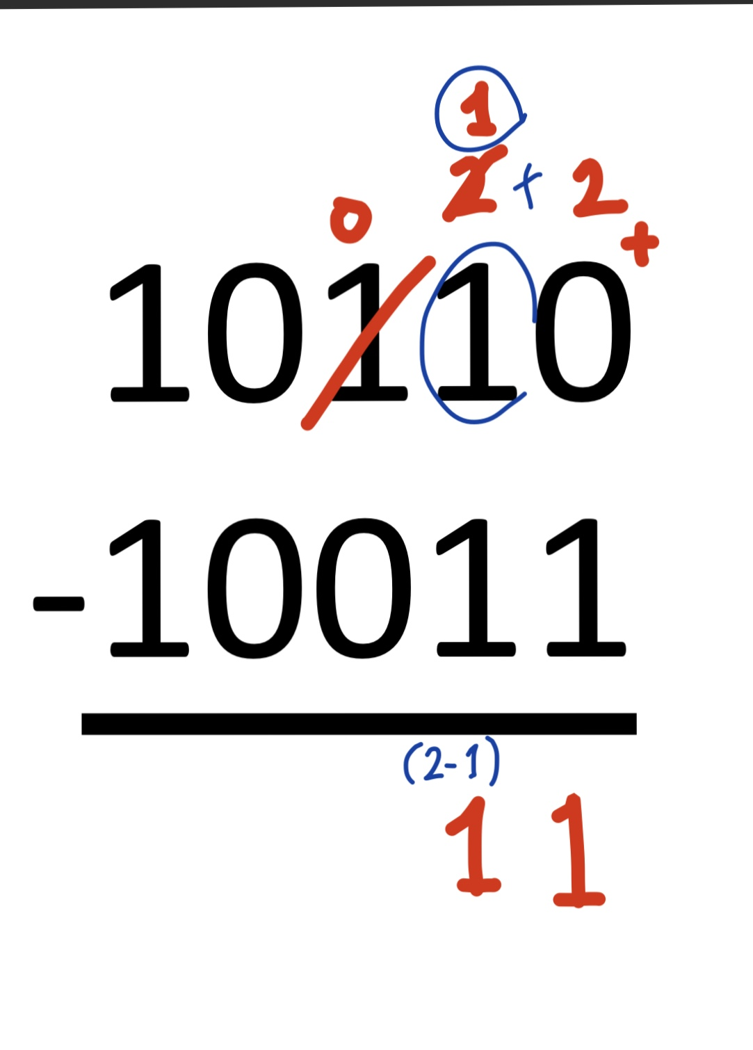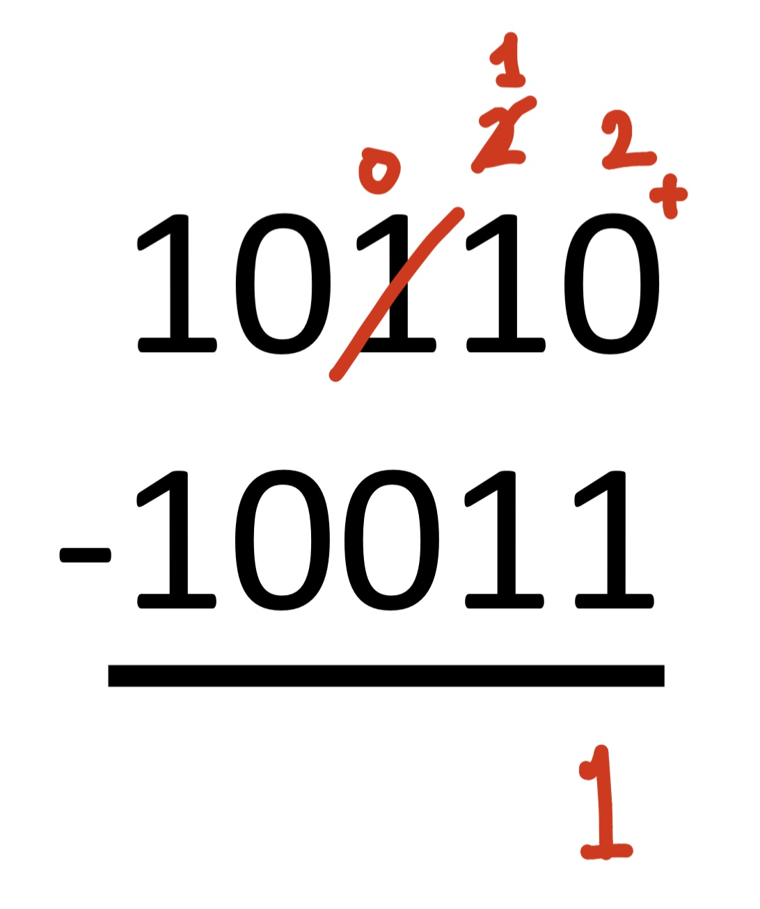 Borrow가 생겨서 빌려온 1과 윗줄의 1을 더합니다. 그리고 2에서 1을 빼면 됩니다.