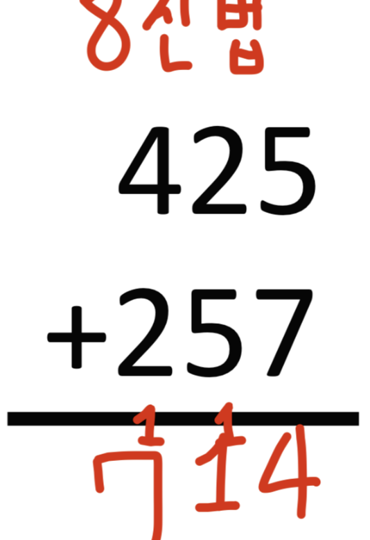 그래서 일의 자리에서 최대 숫자보다 1 큰 8과 5를 더한 뒤 그 숫자에서 7을 뺴주게 되는 것입니다.