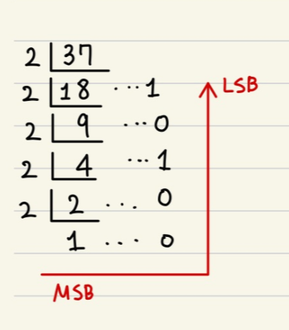1) 먼저 37을 2진수로 변환합니다. (10진수를 2진수로 바꾸는 방법)