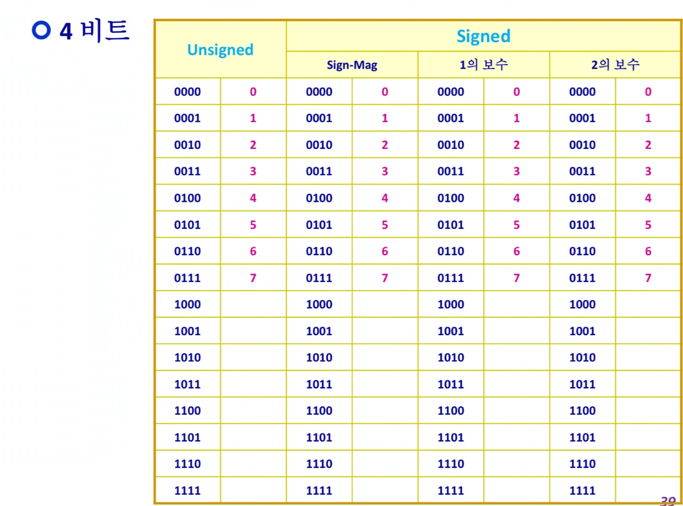 아래의 표에서 형광펜의 윗부분은 4bit에서 MSB가 0이므로 모두 양수가 됩니다.